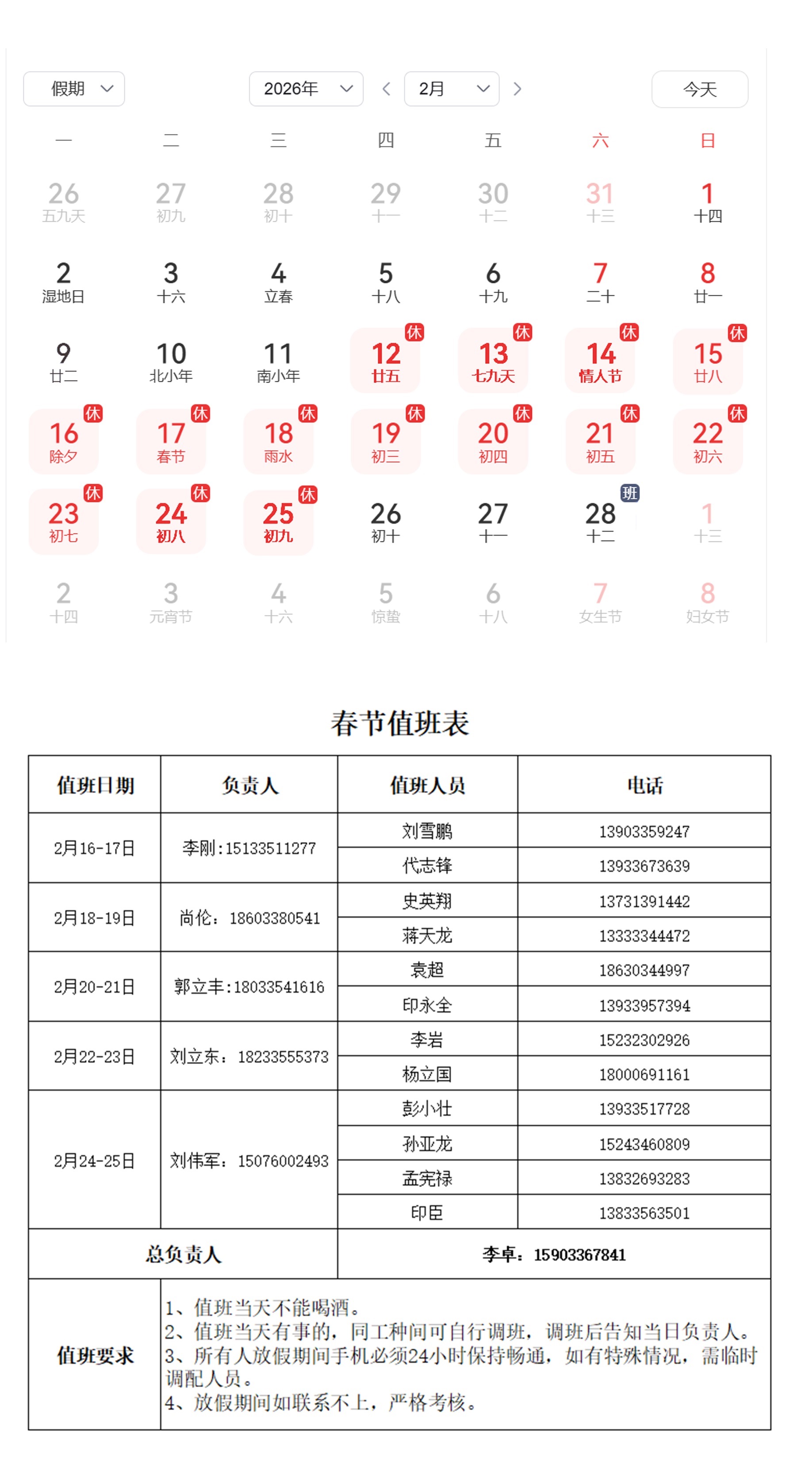 2月12日(周四)至25日(周三)放假調休,共14天2月28日(周六)上班調休